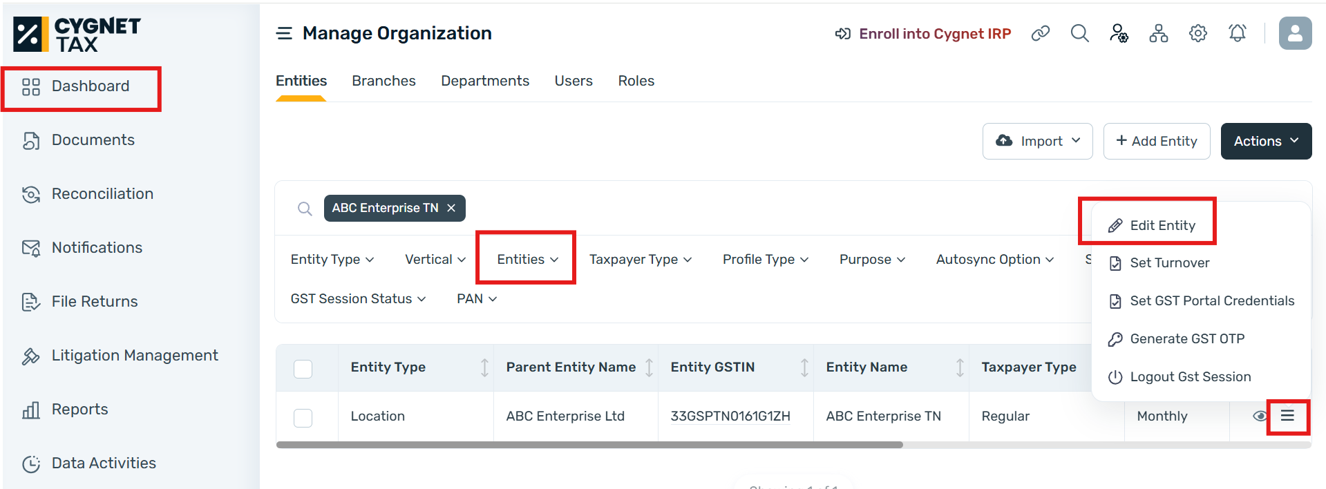 4. Copy and paste the GSTIN for which you are receiving the error into the Entities search option.