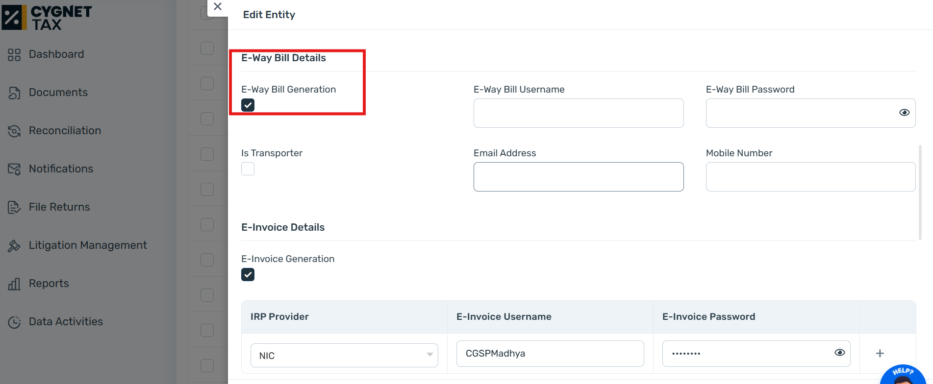 5. Click on the three-line menu on the right-hand side, select Edit Entity, scroll down, and check the E-Way Bill Generation check box should be checked.