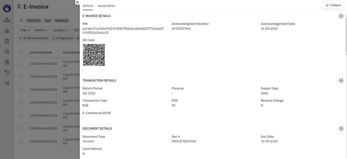 To view the generated E-invoice with IRN, user can filter out the data which is in Generated status. Once user applies the filter, below screen will display all generated records.
