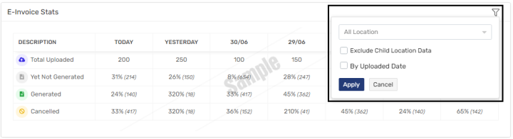 Ø User will be able to view E-invoice stats as per selected location from filter.