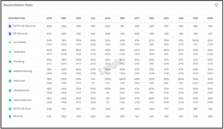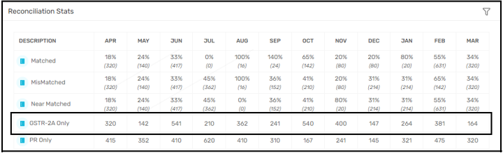 Ø If user applies filter of GSTR-2A Reconciliation, then user will get all Reconciliation stats regarding GSTR-2A Reconciliation.