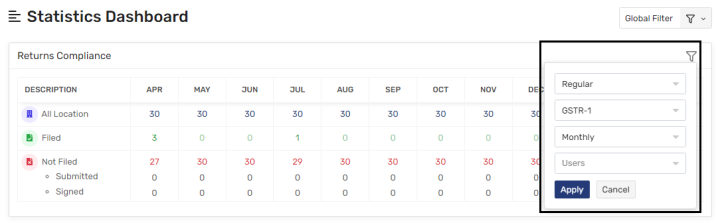 Ø User would be able to view stats regarding Regular Type Returns Compliance for all months from Apr to Mar as per applied Financial Year in Global Filter.