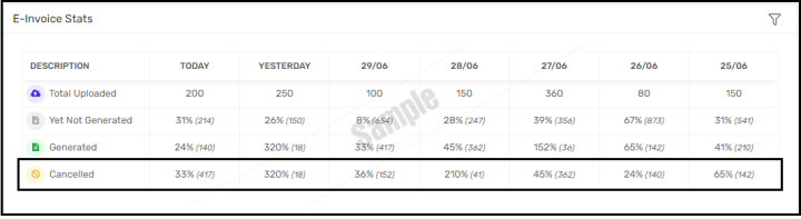 Document with purpose EINV, Generated By Me, Push Status with Cancelled and Cancelled Date = Uploaded Date then count would be displayed here.