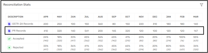 Here, Total count of Records of PR and GSTR-2A which are Mismatched will be displayed month wise.